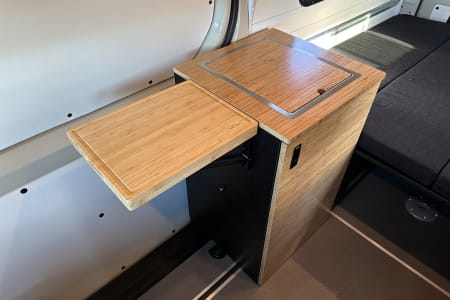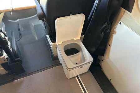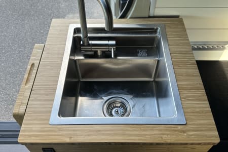 The van also comes with a single burner induction cooktop, fridge / freezer, microwave, electric kettle, trelino toilet (with necessary items including bags) and hot water directly from the sink.