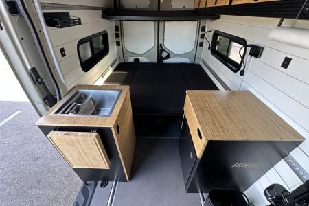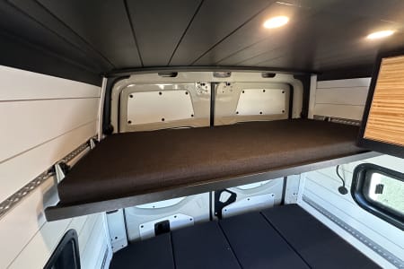 This van was built to take our young family on road trips across the states. There's a main 69x63 inch dinette bed system along with an upper bunk bed (59x24 inch) that can sleep young kids. The dinette bed can sleep 3 adults comfortably. I am 5ft 10 and can sleep sideways with just a slight bend of my legs. Taller individuals can sleep in the center front to back if you're ok with a little overhang! The upper bunk works perfect for kids roughly 4 foot 10 inches or shorter.