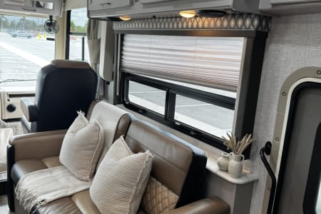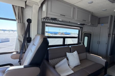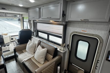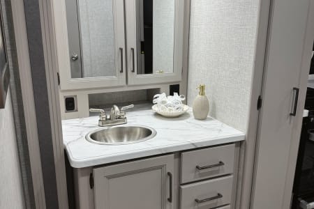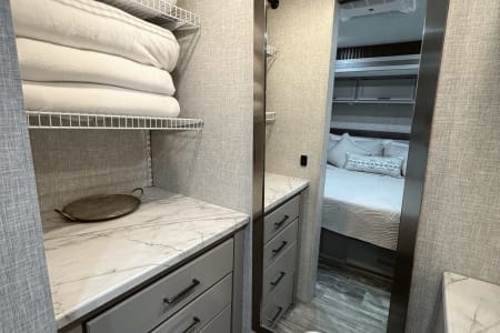 This spacious RV trailer sleeps up to 8 people and comes fully stocked for your next adventure. Setup is a breeze with a power 20’ awning and auto-leveling jacks at all four corners—just press a button and you’re ready.