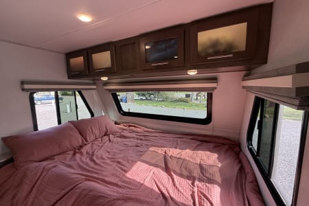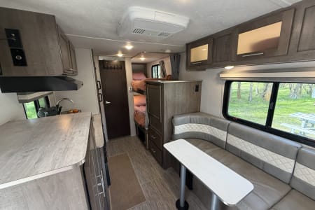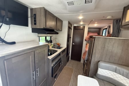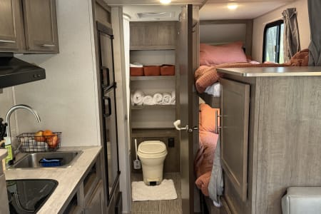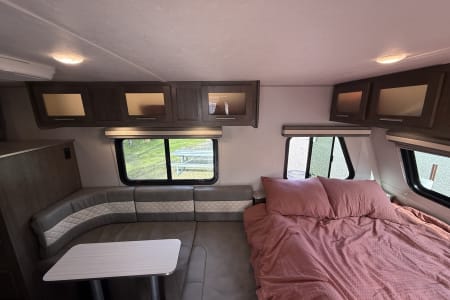 Forest River NoBo 19.7' camper, perfect for family adventures or weekend getaways. This compact yet spacious camper comfortably sleeps 4 with a queen bed and 2 bunks. It comes fully equipped with a microwave, fridge, gas stove, and a bathroom with a shower and toilet. Included with the camper are bedding, pots, pans, utensils, and all the basic necessities you need to hit the road without any hassle. Whether you’re looking to explore the outdoors or just enjoy a cozy space away from home, this camper has everything you need for a comfortable and memorable experience. Ready for your next adventure – don’t miss out!