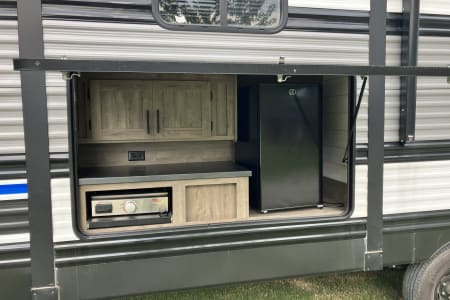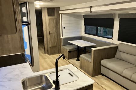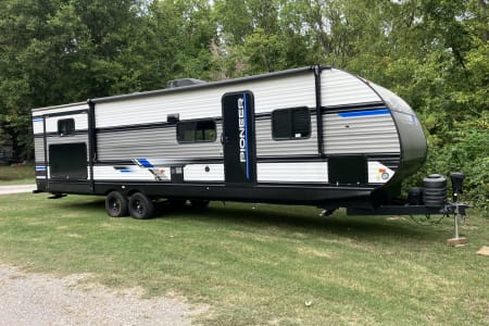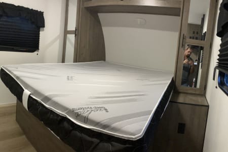 Large family camper with room for everyone. Queen bed up front, three bunks in second bedroom plus sofa bed and dinette conversion. Indoor outdoor/shower, tankless hot water and residential style refrigerator.