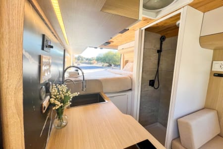 This van doesn’t just look good—it’s built for real adventure. You’ll find a comfy full-size bed, a hot indoor shower (with actual water pressure!), and a fully equipped kitchen with a 3.3 CU refrigerator, stainless steel sink, microwave, and 2-burner induction cooktop. Powering it all is a solid 400Ah lithium battery and 400W solar system, plus a 40-gallon fresh/grey water setup and a 4-gallon water heater. Translation: you can go off-grid without giving up the good stuff.