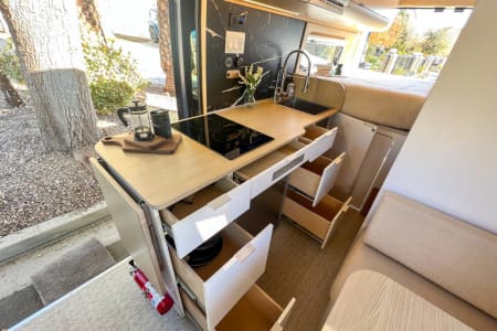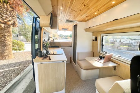 Other smart features? Tons of storage, a two-seat dining nook, multiple table extensions, LED lights, USB plugs, and custom window coverings so you can sleep in or stargaze in peace.