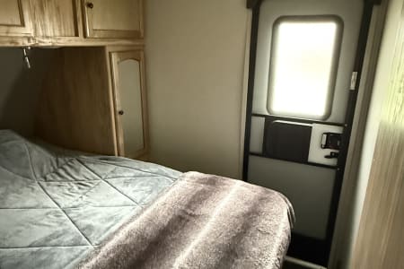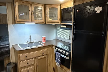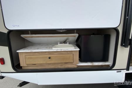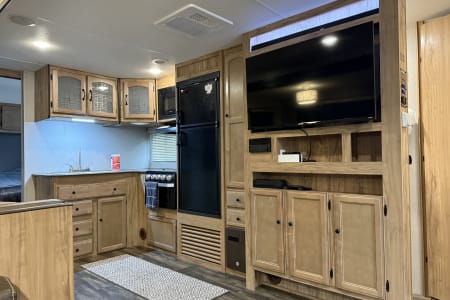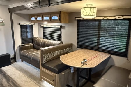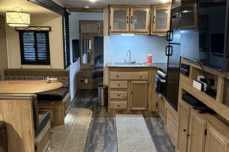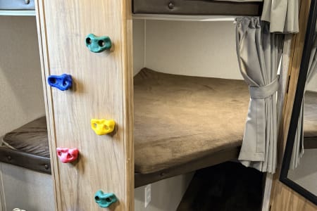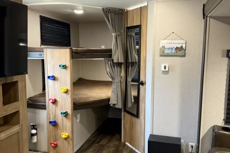 Comes with a private room with a queen bed, and its own entrance. Upper and lower bunk beds with a rock wall to get to the upper. Fold out sofa, and if needed the dining table converts to a bed as well. Awesome closet for plenty storage. We’ve also updated the tv to a 4k smart tv with a sound bar, and subwoofer for awesome movie nights. There is an outdoor bar with fridge and sink.