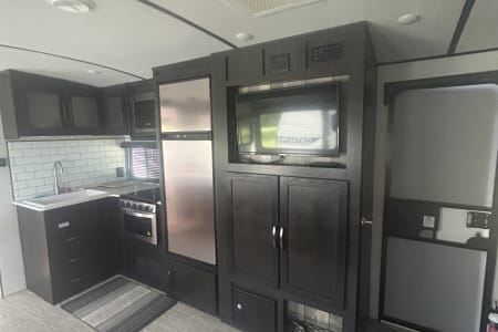 Ample Storage: Pass-through front storage, under-bed storage, and interior cabinets throughout.