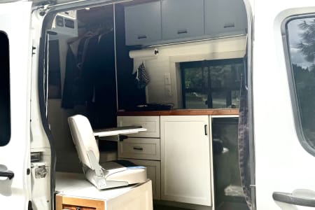 What truly sets this van apart is its self-sufficiency. Powered by rooftop solar panels and equipped with a robust battery system, you'll have reliable electricity for lighting, charging devices, and running the spacious refrigerator. The 20-gallon fresh water system supports the kitchen sink and refreshing outdoor shower, perfect for rinsing off after a hike or beach day.