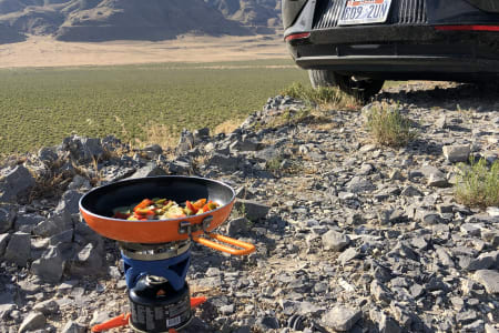 Under our add on section we have everything to make your adventure complete. You can select any of these options and more: nesting cookware and tableware for 4, 24 piece kitchen set, gas burner, electric cooktop, portable water jug, soft shell cooler, backpacking backpacks, lightweight sleeping bags, Big Agnus inflatable mattress, outdoor lighting, toiletry kit, Etc. Just ask and we'll see what we can come up with to simplify and supply your solo or not so solo adventure. You can also sleep in the car to being that it's a hatchback and the seats fold down and form a really comfortable sleeping area for two with our 4 inch air mattress as mentioned above.