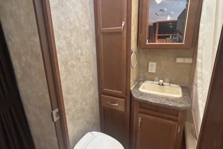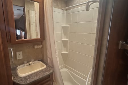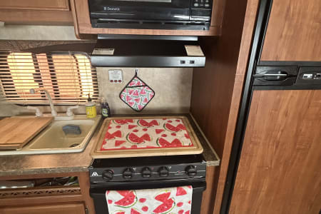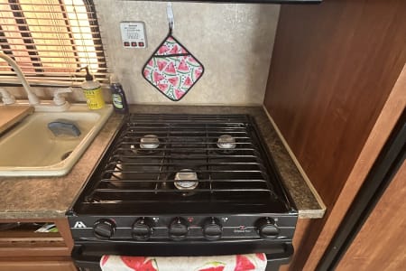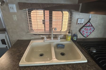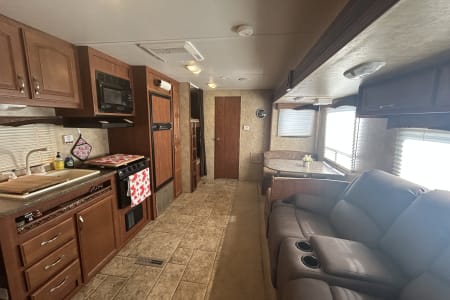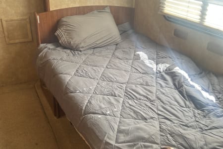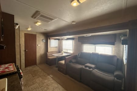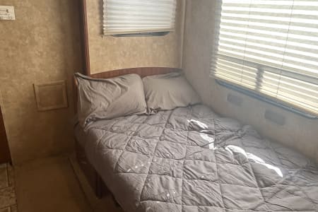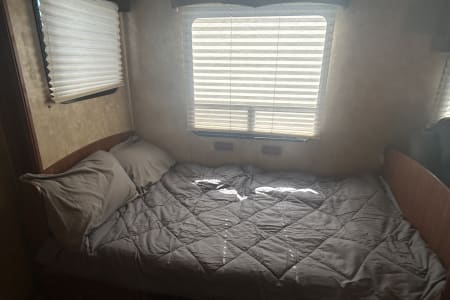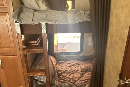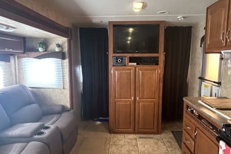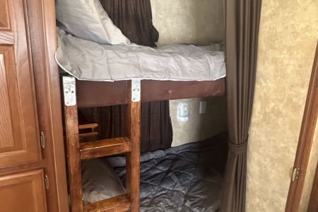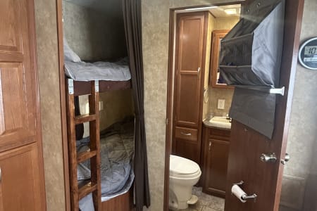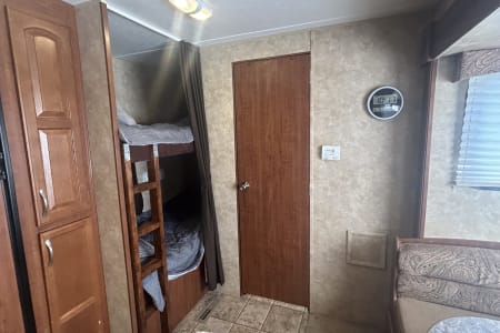 Enjoy this 25 ft camper trailer. There is a queen bed with privacy curtains and a tv. Stretch out on the XL twin size bunkbeds with privacy curtains. The camper also has a dinette conversion to a bed. The camper offers two very comfortable recliners that you can kick back in and watch your favorite movie on the main TV/DVD player.