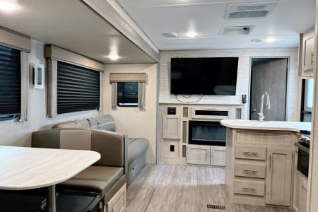 The main living area includes a spacious U-dinette, sofa, fireplace, and a full entertainment center. The kitchen is fully equipped with a large fridge, microwave, 3-burner cooktop, oven, and tons of cabinet space. And when it's time to take the fun outdoors, the outdoor kitchen with a griddle and mini-fridge keeps you cooking under the stars.