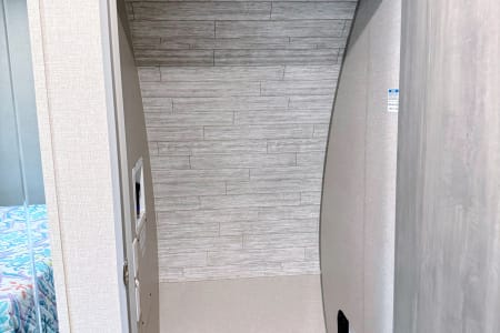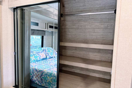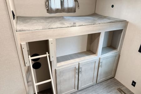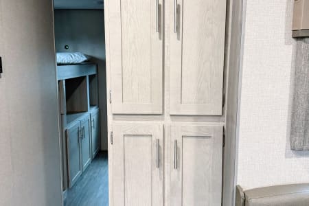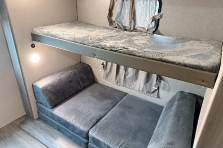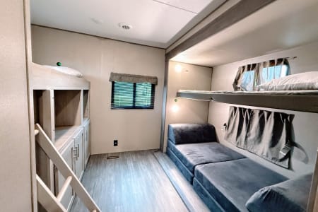 The private master bedroom features a walk-around queen bed, wardrobe storage, and overhead cabinets. At the opposite end, the rear bunkhouse offers two bunks, a fold-down sofa sleeper, storage, and its own entertainment space — a dream for kids or guests!
