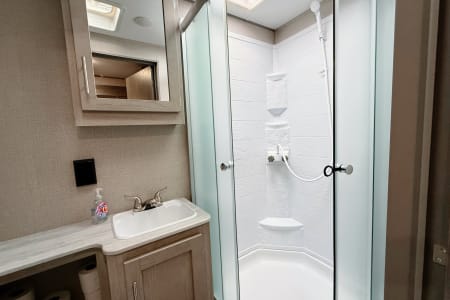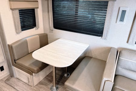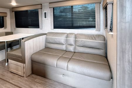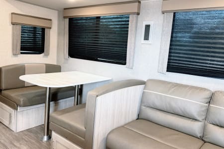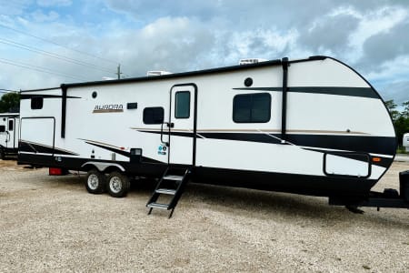 Enjoy the modern convenience of dual A/C units, LED lighting, power stabilizers, and a power tongue jack for easy setup. Whether you're camping at a state park or relaxing at a beachside RV resort, the Aurora 340BHTS brings comfort, function, and style.