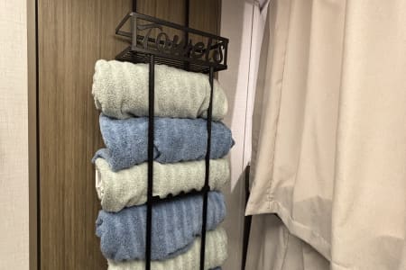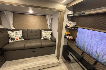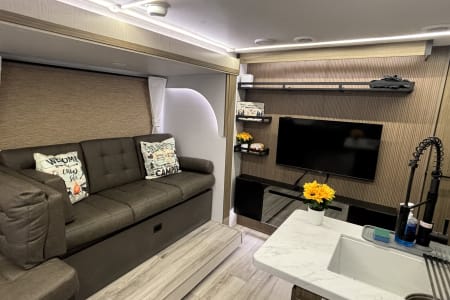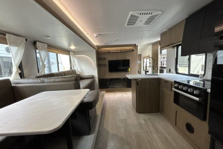 • Fully Equipped Kitchen: Includes a 3-burner stove, oven, microwave, and a 10 cu. ft. 12V refrigerator.