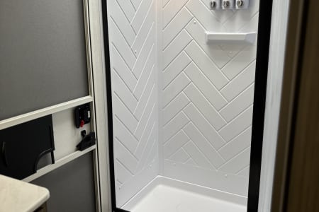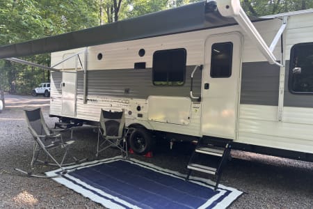 • Outdoor Cooking: Enjoy the exterior camp kitchen with a gas griddle and mini fridge, perfect for outdoor meals.