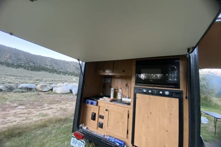 Shared meals cooked at the convenient outdoor kitchen, complete with a two-burner stove, fridge, and microwave. Plus, an outside shower makes cleanup a breeze after a day of fun.