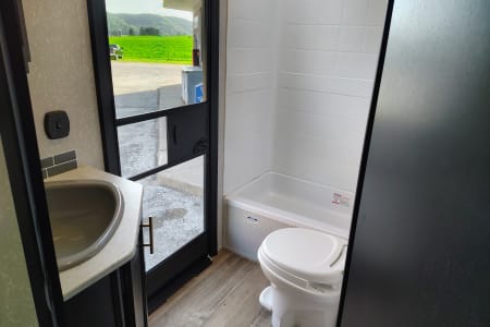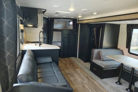 Enjoy the second direct entrance into the bathroom to allow less tracking mud and dirt through the main camper. It also allows easy access to the bathroom while towing to your destination. The kitchen has a large fridge with an awesome pantry and other key features and detail such as cozy electric fireplace, spacious slide-out, 15 feet of awning, doubled rooftop air conditioners, convertible dinette and a jackknife sofa. Outside you will enjoy the LED lighting, outdoor shower, external bike rack, and outdoor kitchen with small beer cooler and ice maker.