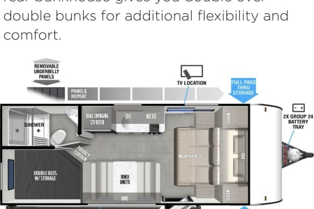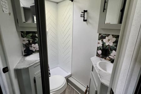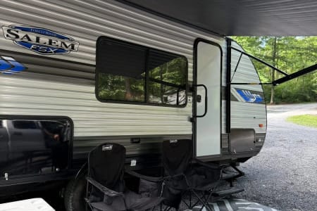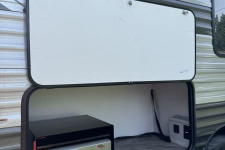 This tiny but mighty family camper will for sure be a safe haven for all of your adventures. We have a queen Murphy bed, a double twin bunk bed (200lb weight max each), & the dinette converts in to a bed. We can comfortably fit our family of six in here. We love clean, minimalist, & boho vibes. This cozy camper will help you unplug & connect with each other in God's creation! Our outdoor kitchen is one of our favorite things. Open up the electric awning & grill away. Our coffee maker & air fryer is also in the outdoor kitchen.