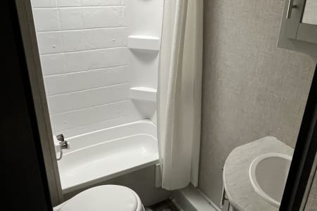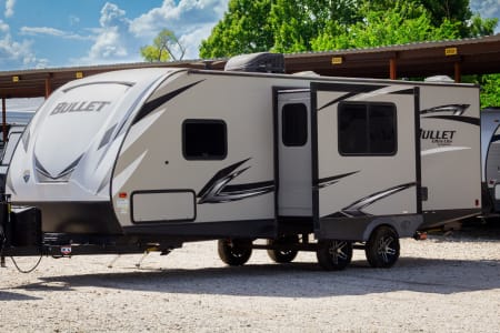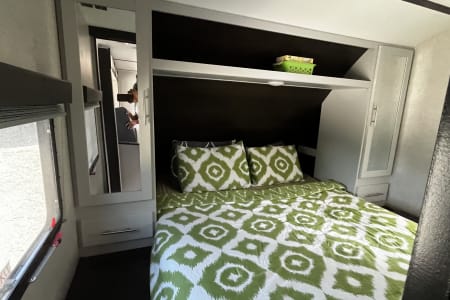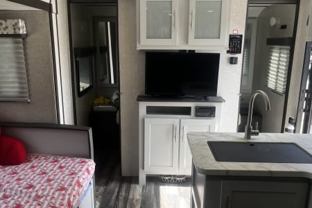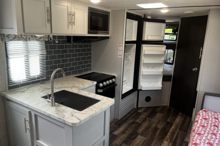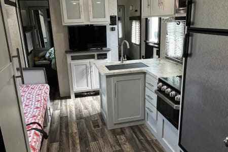 Looking for the perfect home away from home for your next adventure? This well-kept travel trailer is your ideal getaway companion! Spacious yet lightweight, it comfortably sleeps 6–8 people, making it perfect for families or groups. It’s towable by many mid-size SUVs and trucks, so you don’t need a massive rig to hit the road. Inside, you’ll find everything you need for a hassle-free trip: a fully stocked kitchen with pots, pans, utensils, a coffee maker, and even paper towels and toilet paper. Fresh towels are also included to make packing easy. For even more convenience, enjoy the outdoor kitchen equipped with a mini fridge and stove—perfect for cooking under the open sky. There’s also an outdoor shower for rinsing off after a day of hiking, swimming, or relaxing. A backup camera makes parking and maneuvering simple.