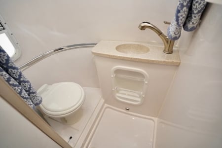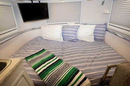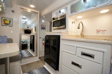 This lightweight single-axle trailer is easy to tow and packed with high-end features. Inside, you’ll find a cozy seating area that converts into a sleeping space, a fully equipped kitchen with a two-burner LP stove and dual-power refrigerator, and a bathroom with a porcelain toilet and shower—everything you need for a comfortable, self-contained getaway.
