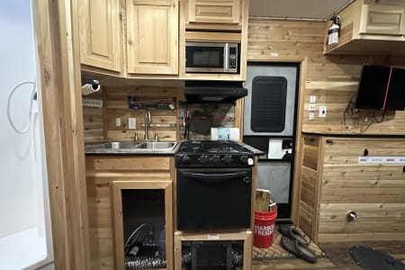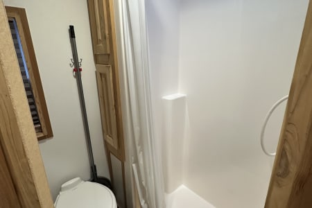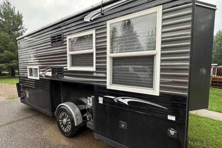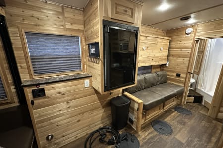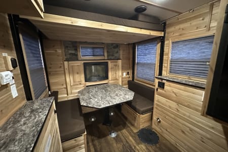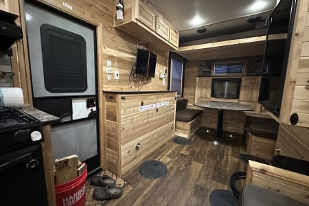 This camper features 2 bunks, a jack knife sofa, a dinette which turns into a bed. There is a Roku tv. There is a double kitchen sink, a toilet, shower, hot water, oven, fridge, stove and oven, and microwave. Overall the perfect family camper for going on a trip or camping or whatever you have in mind.