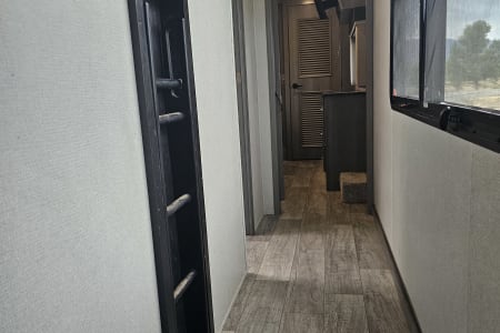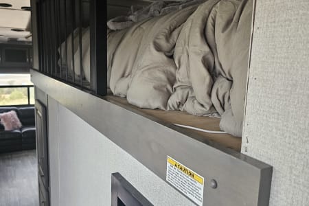 Bunk Room & Private Space: A dedicated small room under the bunk bed equipped with a fold-out full-sized bed and a desk area, ideal for kids or work/study needs