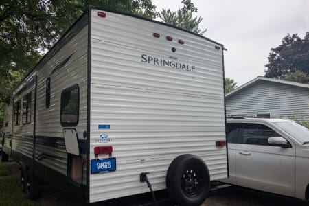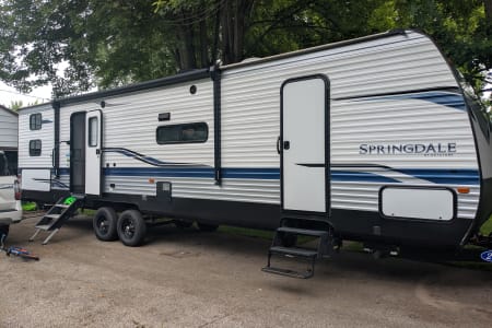 Here we have a 2022 Keystone Springdale 335BH with the Artic Package. She can sleep 8 comfortably with room for 2 more depending. Up front we have a private queen bedroom with storage space for clothing, TV and a private exterior door. Next to that is a full pass through bathroom with medicine cabinet. The living space is large with the only slide out, full galley kitchen with a large refrigerator and plenty of storage. The couch is a futon style bed and the dinette folds down as well. There is a fireplace, indoor/outdoor bluetooth radio and a TV. To the rear we have a half bath, closet space, 2 bunkbeds totaling 4 sleeping spaces and a TV; did I mention this was a private bedroom as well! Outside we have a 20ft awning, tons of storage outdoor kitchen with cooktop and mini fridge. You have everything you'll need for a fun and relaxing vacation.