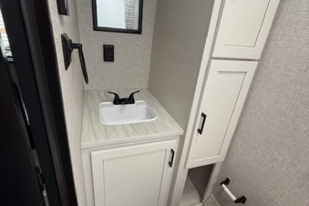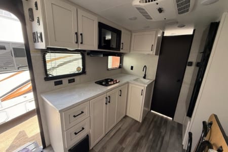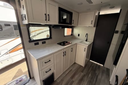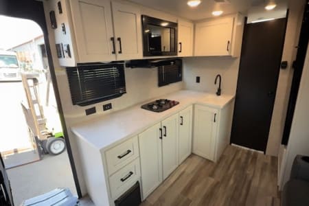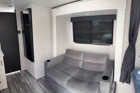 This single-axle couple's travel trailer is sure to bring you happiness at the campground. There is a front queen bed with a privacy curtain if you have a guest staying over on the jack-knife sofa, and the movable table in front of the sofa will provide more floor space when needed. A cooktop and microwave oven will let you make meals each day, and an 8 cu. ft. 12V refrigerator will be perfect for perishables. This model also includes a full rear bath with a tub/shower, a toilet, plus a sink and a linen closet for clean towels. The optional Baja Package can be added on this model which includes 16 in. off-road tires, a deluxe graphics package, triple entry steps, and more!