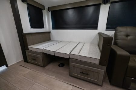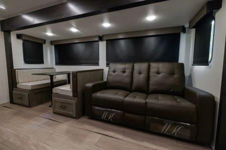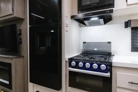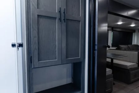 The Alpha Wolf 25RB by Forest River is highlighted by a spacious rear bathroom that has plenty of storage. The kitchen is well thought out and features a hidden pantry, 12-volt refrigerator, farm style sink, oven and microwave. The dinette doubles as an extra bed when not in use and provides good seating space along with the foldable couch in the living area. Relax in the bedroom with a queen size bed, ample wardrobe space and a laundry chute. Included an an outdoor kitchen with refrigerator, ice machine, and propane connect for grill/external fireplace.