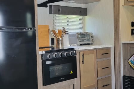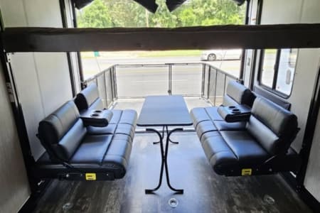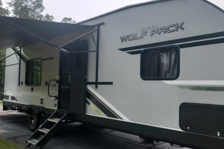 Hi, we are Victoria and Alan. we purchased a 2021 wolf pack toy hauler and have enjoyed camping in it so much that we would love to share. We would love to have you make great memories as we have. This camper is a Toy hauler. It has a king private master bedroom with a bunk system in the main living area. The upper queen bunk lowers and has a 275lbs combined weight limit. I wound not recommend the top bunk for small children. The two couches can be made into a queen bed as well. There is also enough room if you prefer you could use an air mattress. If you want to book please send me a message as well, so we can get your fun started off right