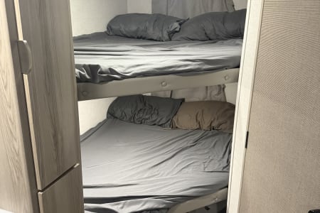 The Forest River Salem FSX 266BHLE is a travel trailer designed for comfortable family camping, sleeping up to 8 people. It features a double over double bunkhouse layout and a private front bedroom with a king-size bed including sheets and pillows, dual wardrobes, a full bathroom with a 36" x 24" shower, and a mid-kitchen design maximizing space. There is a super lounger/couch area in place of the traditional dinette that pulls out to an oversized bed. Modular dinette table can be used inside or outside. Silverware, dishes, pots&pans, cleaning supplies, Camping chairs, blackstone, and k-cup coffee maker provided