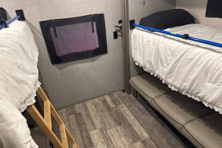 • Separate bunk room with two twin bunks, its own half bathroom, and a sleeper sofa