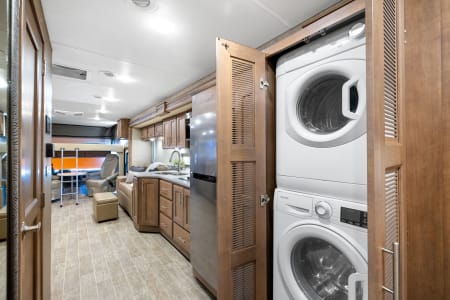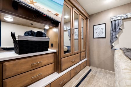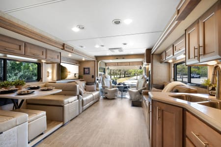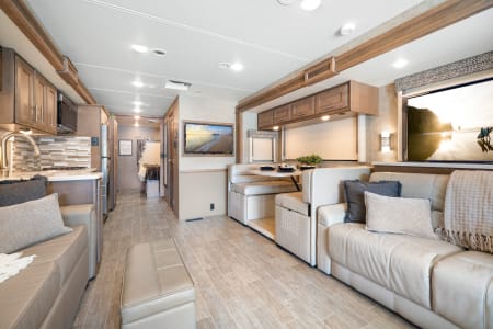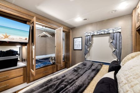 "FULLY STOCKED RV including all bedding". Come spend time with your family in this oversized Motor Coach and create memories with your family, our coach has four flat screens, 1 king bed and 1 queen and two pull-out full-size beds, walk in shower, overabundance of storage and closet space. We have fully stocked this Motor Coach for your enjoyment, ADDITIONAL DEPOSIT IS REQUIRERD FOR OUT OF STATE TRAVEL, PLEASE SEND EMAIL FOR DETAILS. No animals of any kind on RV due to severe allergies.