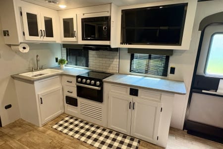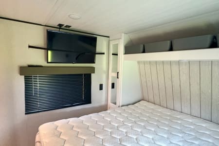 - Entertainment: Roku flat-screen TV in the living room and a second Roku flat-screen TV in the master bedroom, as well as blue-tooth stereo system both inside and outside the trailer.