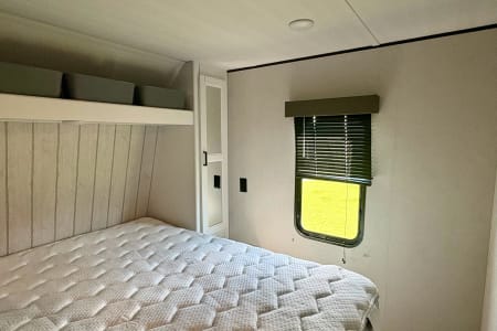 - Beds: Private master bedroom with a queen-sized bed, double full size bunk beds for the kids, and a foldout sofa that transforms into a full size bed.