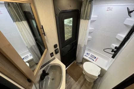 Inside, you’ll find a bright and modern living space with everything you need to feel at home on the road. The private master bedroom offers a cozy queen bed, while the double over double bunks and convertible dinette and sofa provide plenty of space for kids or extra guests—sleeping up to eight comfortably. The full kitchen is equipped with a fridge, stove, oven, and microwave, and the bathroom with a shower makes camping simple and convenient.