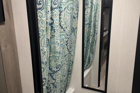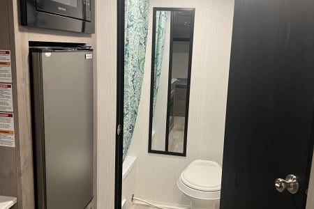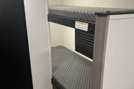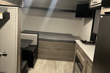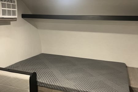 This small but mighty camper is the perfect size for a small family. Sleeps 4 comfortably with a queen bed and twin-size bunk beds (dinette can also fold down into a bed, if needed). Camper also includes a small refrigerator, microwave, 2 burner gas cooktop, air conditioner, an electric fireplace, a tub/shower combo, and a power tongue jack.