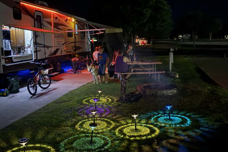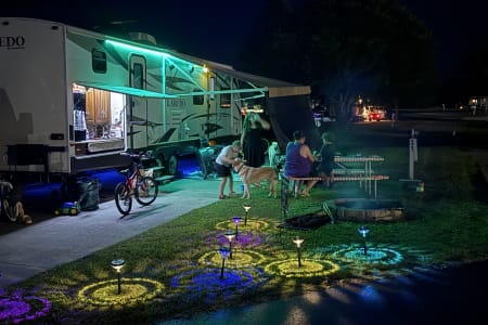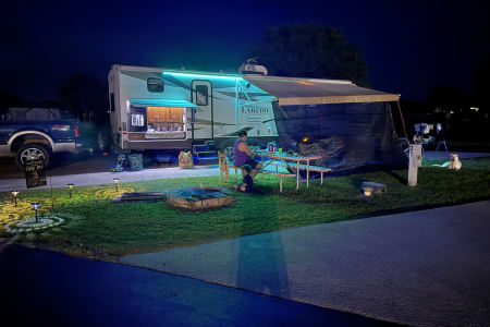 Bunkhouse/ tailgate hybrid with tons of space to use as you like. Large outdoor kitchen with additional refrigerator and camp fire utensils. Bunk area has camper size full bed and twin above fold out sofa back area turns into a semi private area for the kids . The dining table also converts to a bed. And a fold out sofa in main area as well.