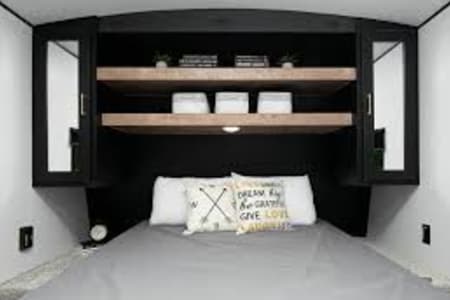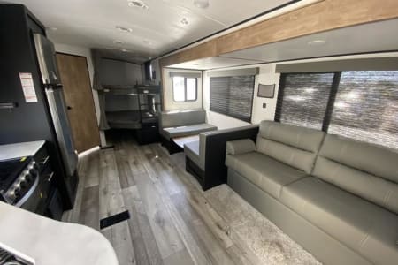 Has flat screen smart tv in bedroom and living room. Fireplace, Bluetooth inside and outside speakers. Outdoor drugs included. Lots of open space for if a rainy day hits. Have lots of space to hangout inside.