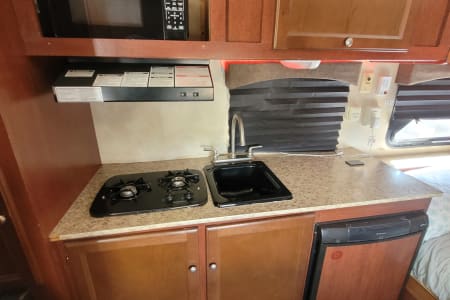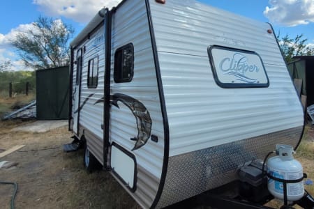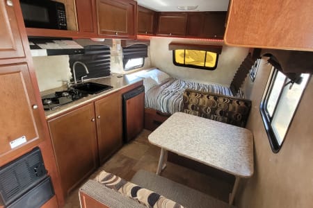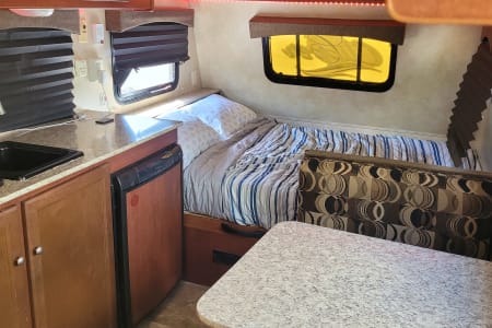 Thanks or considering our rv. This camper is CLEAN AND SHINNY! A nice small easy to tow 1 bedroom Rv with 1 full size beds and a dinette conversion for a small child or two. We keep it stocked with the basics: linens, towels, paper products, and basic cooking supplies.