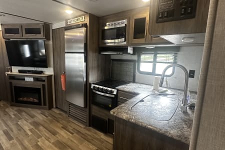 The 2021 Crossroads Zinger is the perfect getaway camper for families or solo travelers looking for comfort, space, and convenience. With sleeping room for up to nine, including a private front bedroom and rear bunkhouse, it’s built for flexibility. Two slide-outs and tall ceilings create an open, airy interior, while features like a fireplace, large pantry, and two bathrooms add everyday ease. Outside, enjoy LED-lit speakers, solar prep, and an outdoor shower for all your adventures. Designed for year-round use and easy towing, this travel trailer is as practical as it is inviting. Whether you're hitting the road solo or with loved ones, the Zinger promises a memorable escape with all the comforts of home.