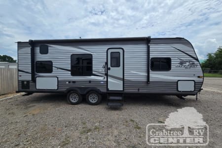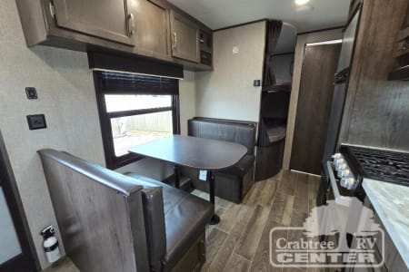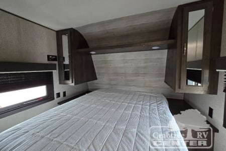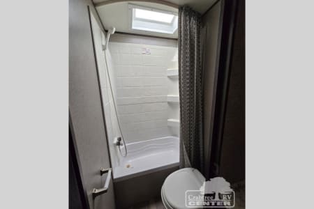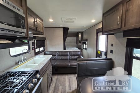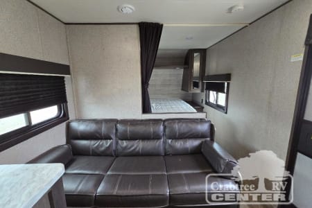 The whole family can head to the campground with this travel trailer! Everyone will start each day feeling re-charged and ready to go after sleeping on the rear corner double bunk beds and the front queen bed, plus the sofa and the booth dinette can also transform into extra sleeping spaces for any friends that want to tag along. The rear corner bathroom comes with a tub/shower that has a skylight above for natural lighting. There is plenty of storage inside and out between the overhead cabinets, the wardrobes, and the exterior pass-through storage area.
