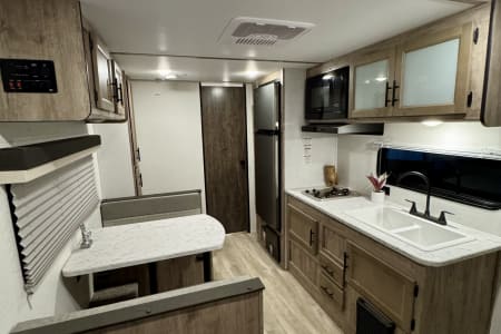 This cozy camper sleeps 4 adults or 2 adults with 4 kids (depending on how much you like each other). Comes stocked with kitchen essentials, chairs, bedding, and toiletries – just bring your snacks and your sense of adventure.