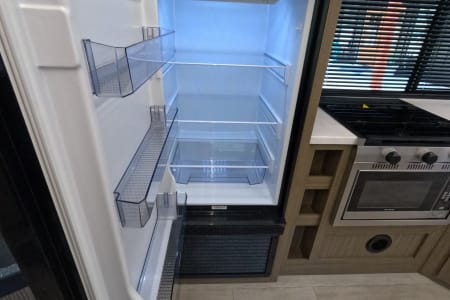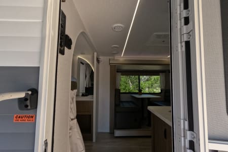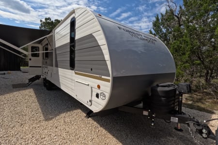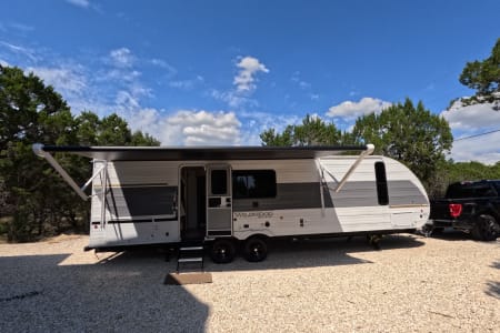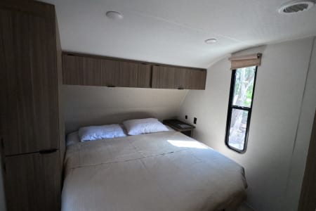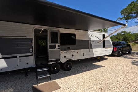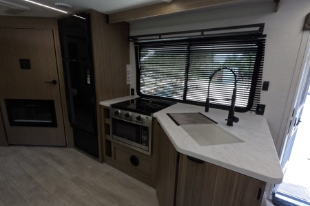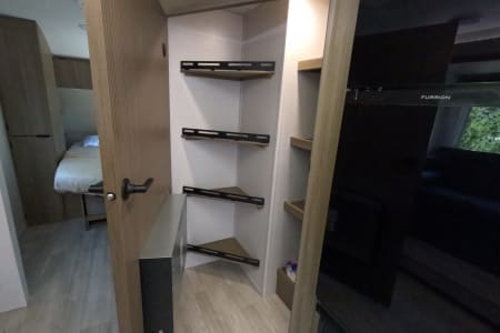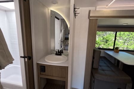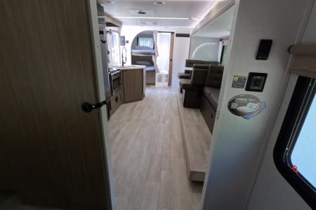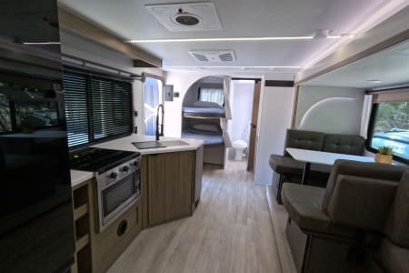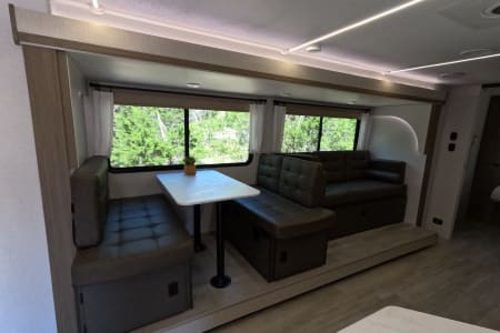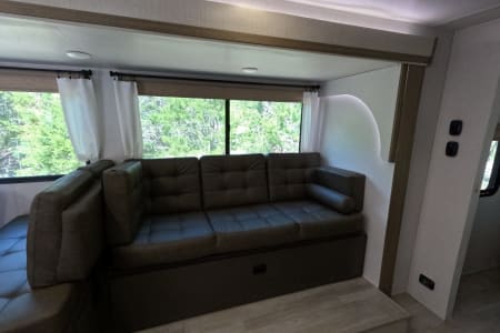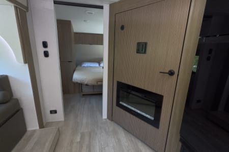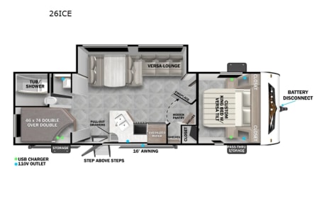 You're sure to make camping memories in this spacious travel trailer! You can easily sleep eight people each night thanks to the double-size bunks, the custom king bed with Versa Tilt in the front bedroom plus the Versa-Lounge within the large slide out! The three burner cooktop and microwave oven will let you make meals each day, and you'll appreciate the hidden pantry with shelves behind the fireplace. There is also a booth dinette where you can dine together or play a game of cards after dinner is cleaned up, or you may just find yourselves outdoors under the 16' power awning with LED lights. And don't overlook the full bath, complete with a tub/shower that will make bath time easier if you have little ones.