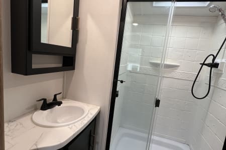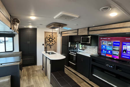 Inside, you’ll find a private master bedroom, a separate bunkhouse for kids or guests, and a large living area with reclining seating and an entertainment center. The full kitchen features a refrigerator, stove, oven, and microwave — everything you need to prepare meals with ease. A roomy bathroom with a full shower adds to the home-like comfort.