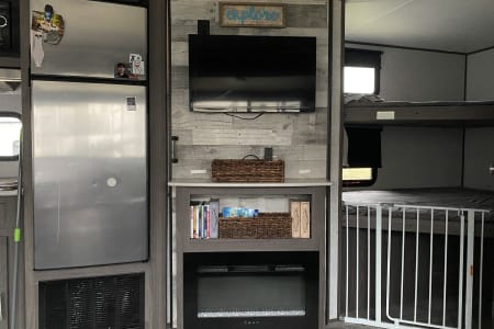 Inside, you’ll find a cozy queen-size bedroom retreat and oversized bunk beds that are perfect for kids, friends, or just sprawling out after a long day of fun. The spacious kitchen comes with tons of hidden storage, so you can pack all your snacks and supplies without feeling cramped. When it’s time to relax, flip on the electric fireplace — no firewood required — and enjoy a true glamping experience in comfort and style. Tripod makes camping easy, cozy, and full of memories waiting to be made.