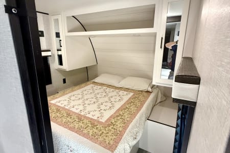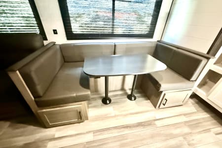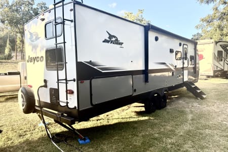 Nice brand new 34 foot bunkhouse with a slide that sleeps up to 8 people with a private master suite with a queen bed, 2 double bunks, and a dinette that converts to a bed.