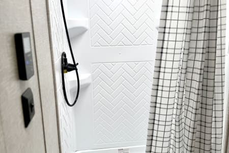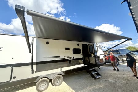 Also features an outdoor kitchen with refrigerator and griddle as well as a large awning, outdoor shower, and plenty of storage.