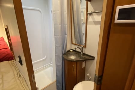 Inside, the smart layout maximizes space. The U-lounge seats 4, plus 2 more when the captain’s chairs swivel. The dining area has hosted up to 6 and easily converts into a double bed for guests. The washroom is impressively roomy, with a large shower and instant hot water.