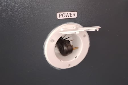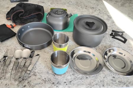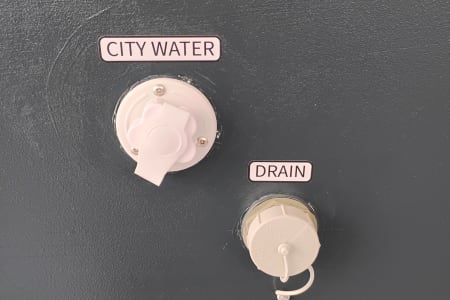 There is a portable water tank for sites with no water hook up and a portable grey water tank for outside. Propane stove, microwave and cooler that plugs in like a refrigerator.