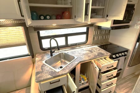 The RV will be supplied with basic kitchen cooking utensils, plates, bowls, cups, eating utensils, pots & pans, cutting board, Coffee maker, kitchen hand towels, 1 roll of paper towels, small dish soap bottle, dish sponge, hotel style hand soap, Bath towels, 2 rolls of toilet paper, Trash cans with 2 trash bags, Power cord and adapters, water hose, sewer hose, and leveling blocks.