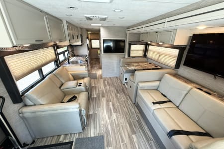 Ride in style and comfort with plenty of seating for everyone! Relax in the theater recliners with your cup of coffee in the morning with plenty of living space for everyone to gather. The Thor ACE sleeps 6 with KING master bed with slide out and it's own AC in the master suite, an electronic upper loft the lets down above the captains chairs making a full sized bed, the sofa is a jack knife up out that can sleep 2 mall kids as well as the convertible dinette booth. A well stocked kitchen with all your basic cooking needs with a gas oven/cooktop, microwave, and fridge/freezer. This RV is equipped with 2 air-conditions, a gas generator and fresh water holding tank as well. Outside there is plenty of storage, an outside TV, power awning, and comes with all the necessary hook ups. Driving this class A RV does not require any special license and is easier to drive than you think! The RV is on a Ford gas engine chassis and easy to operate.